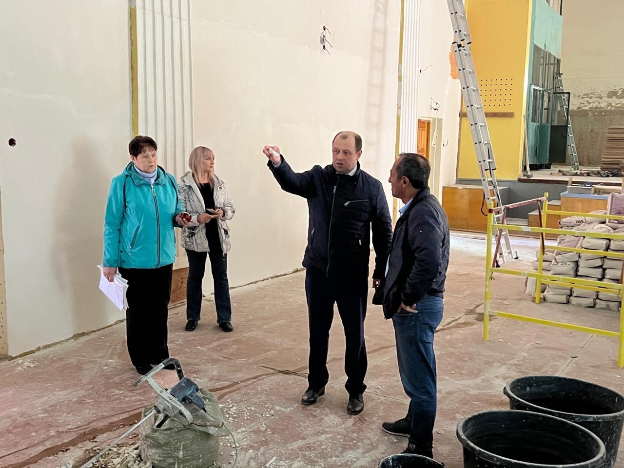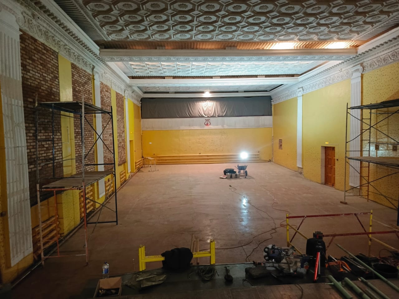 Первым делом взялись за актовый зал. Сейчас ведутся работы по демонтажу старых полов и выравниванию стен.