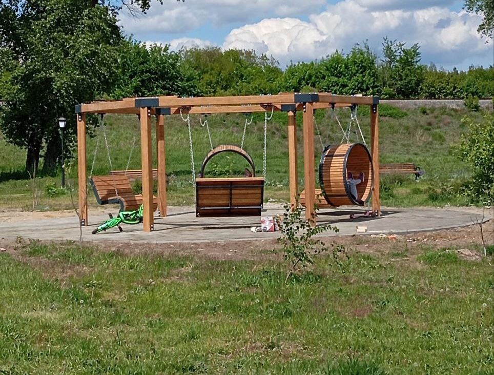 А в зоне отдыха появились уютная пергола с подвесными скамейками и оригинальные качели в форме кольца.