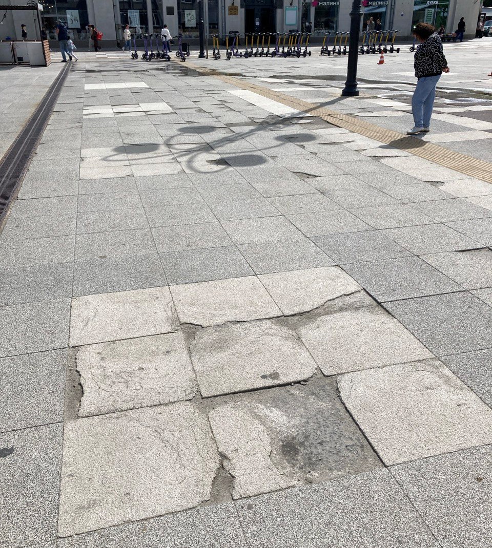 При обсуждении саратовцы возлагают вину в разрушении плитки то на тяжелую технику коммунальщиков, то на электросамокаты и даже паровозик - все они ездят регулярно по площади. Другие винят саму плитку. Хотя власти неоднократно сообщали, что по документам плитка соответствует всем нормативам по нагрузке.