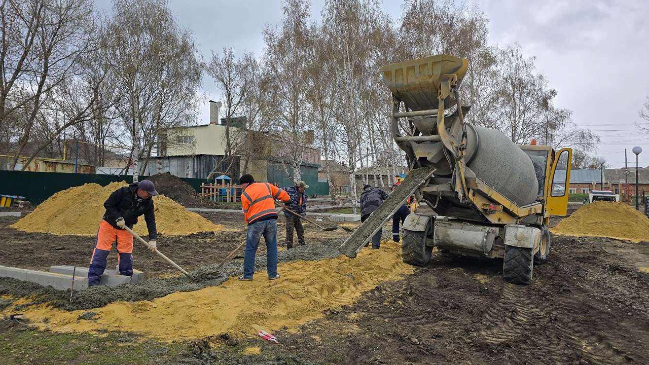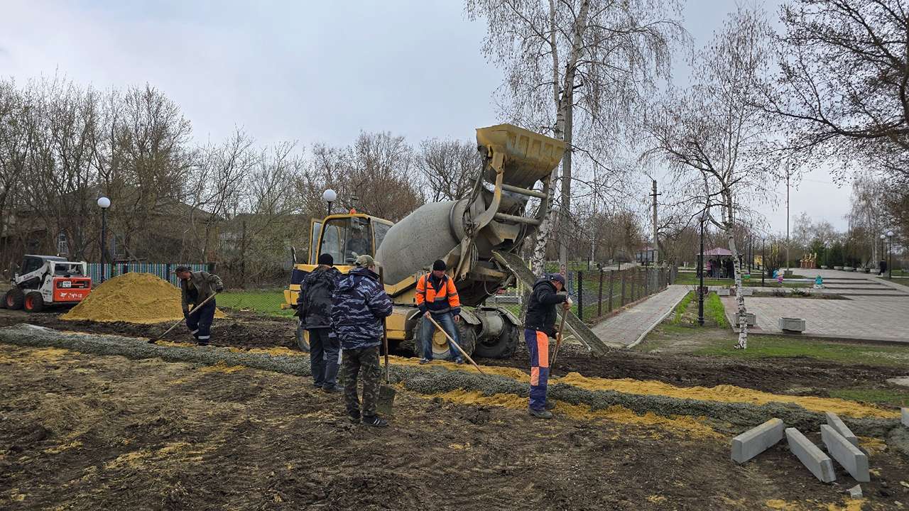 В настоящее время в городском парке ведутся подготовительные работы по благоустройству. Уже разровняли грунт, устанавливают бордюры, заливают бетон под основу площадки.