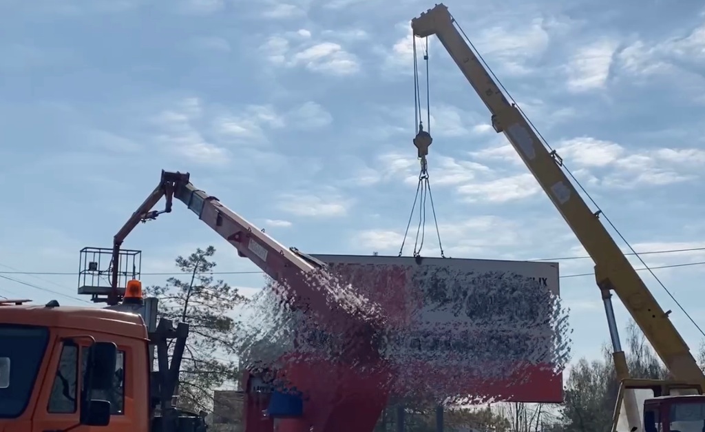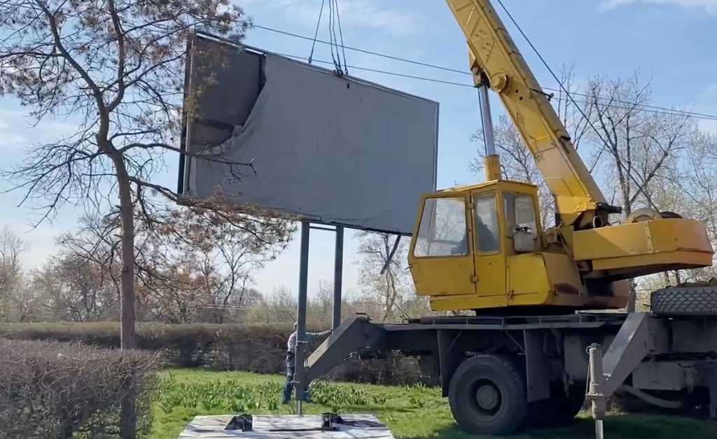 Вчера, 16 апреля, глава района лично наблюдал, как муниципальные службы демонтировали несколько массивных рекламных конструкций на остановке «Мостоотряд», вблизи стелы «Энгельс». Рабочие краном сняли щиты и распилили на металл.