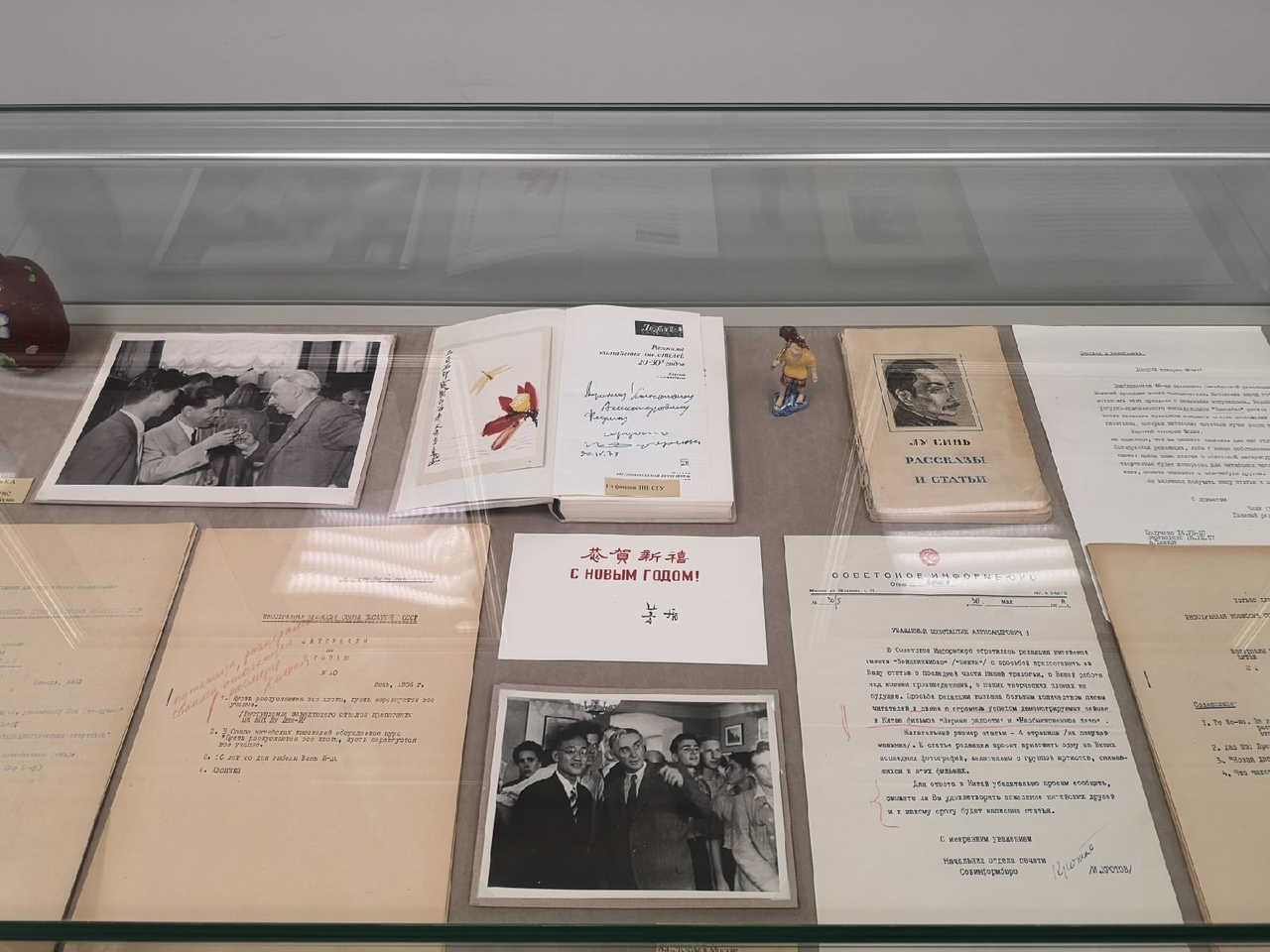 Собрание уникальных артефактов, проливающих свет на малоизученную историю связей писателя с КНР, уютно расположилась на первом этаже отремонтированного музейного здания. Среди них - письма профессора Цао-Цзинь Хуа, фотографии писателей Мао Дуня и Ба Цзиня и гравюры известного художника Ци Бай-ши.